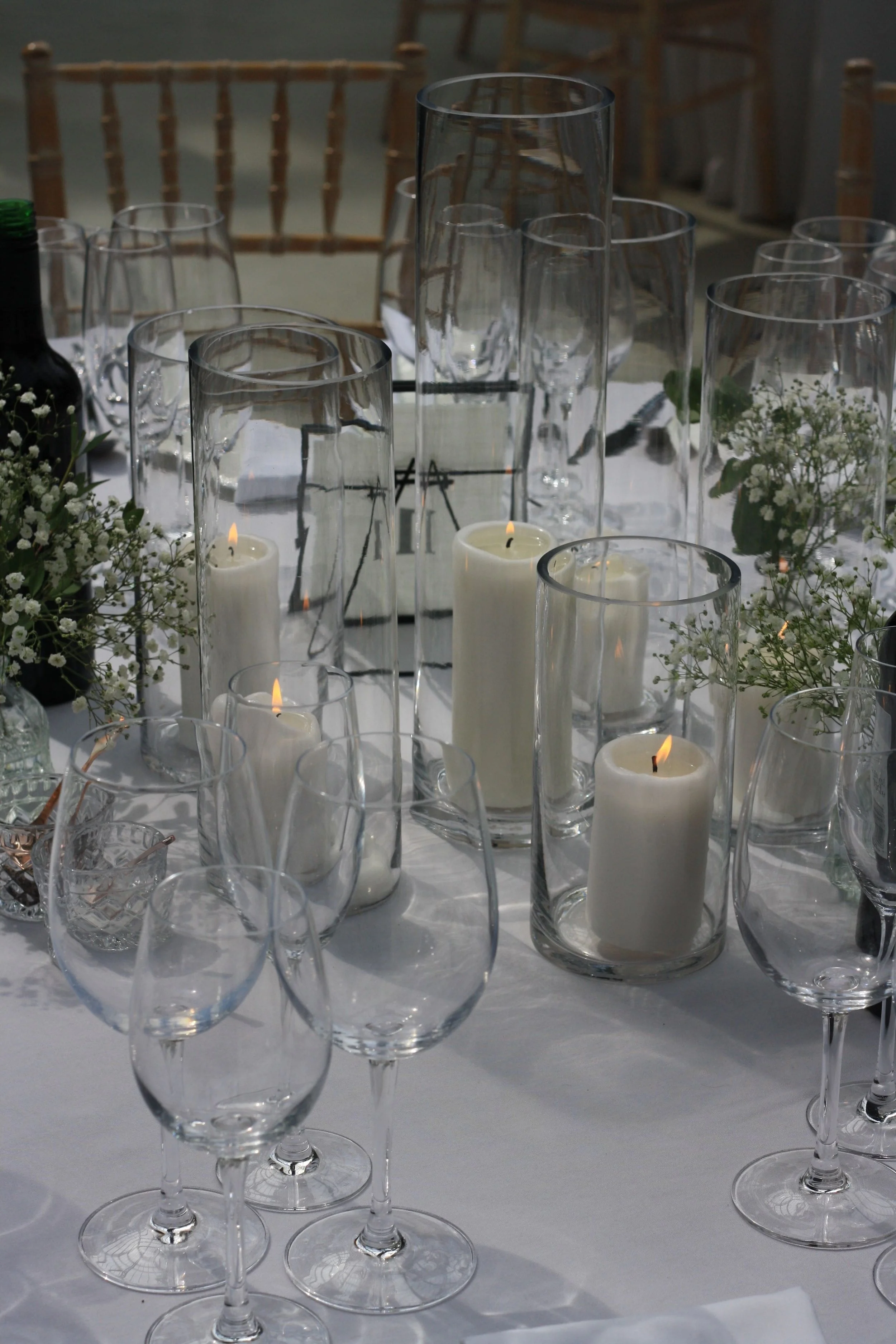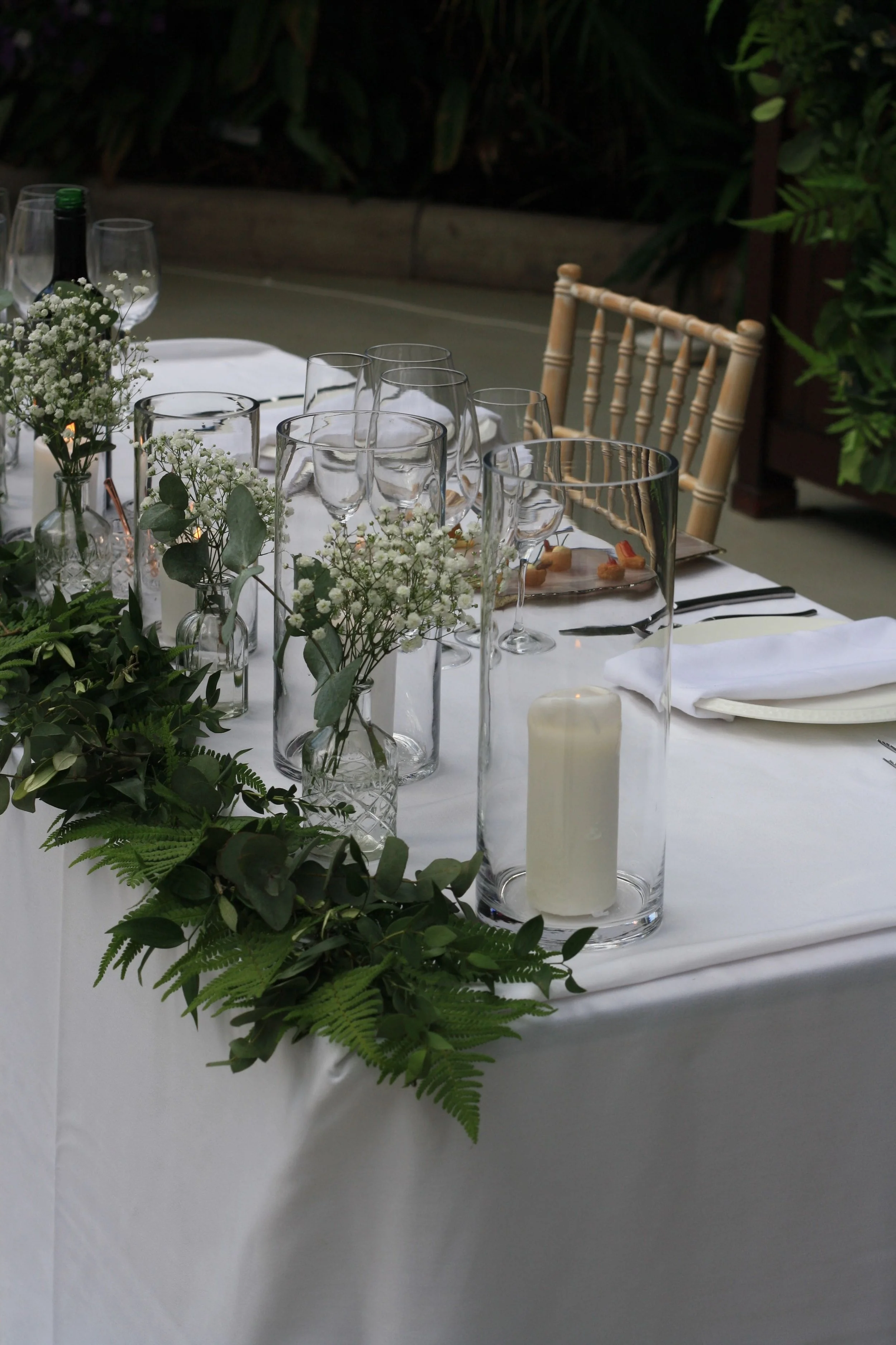 After the ceremony, our team remained onsite to seamlessly restyle the space for the wedding breakfast. The candles were repurposed onto the dining tables, joined by delicate bud vases filled with gypsophila to create a light and romantic feel. The top table was adorned with a lush greenery garland, anchoring the overall botanical aesthetic.